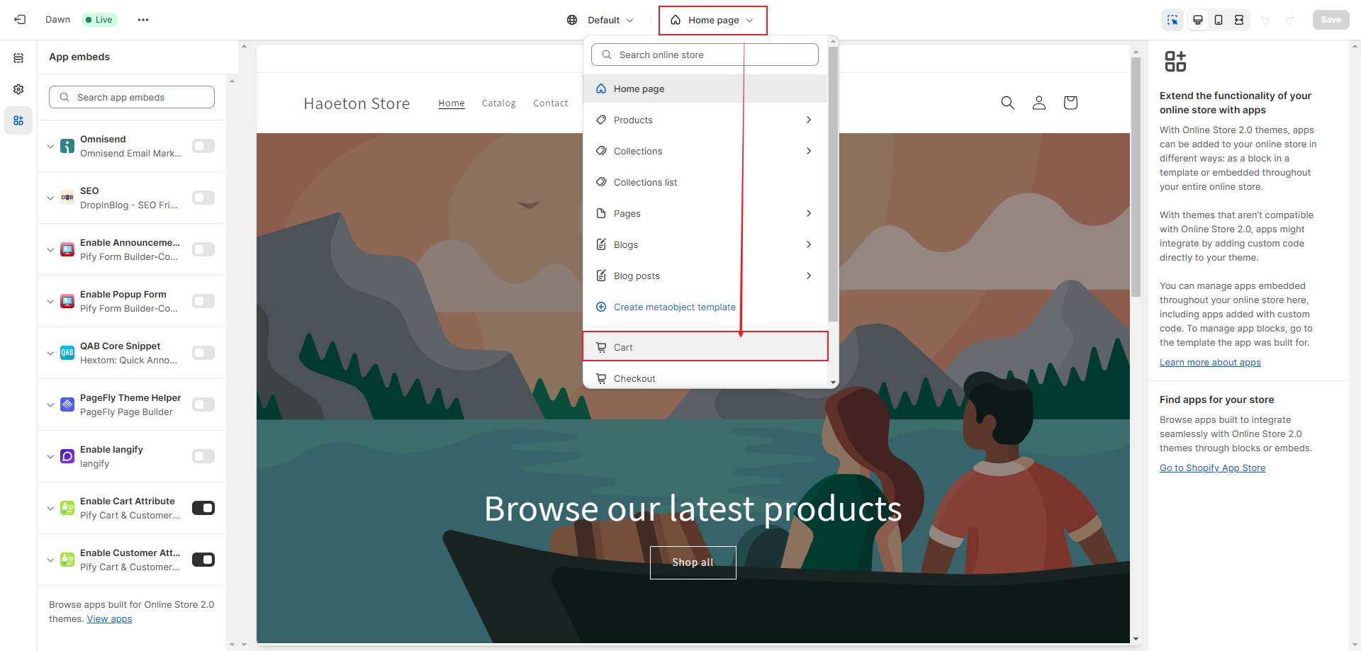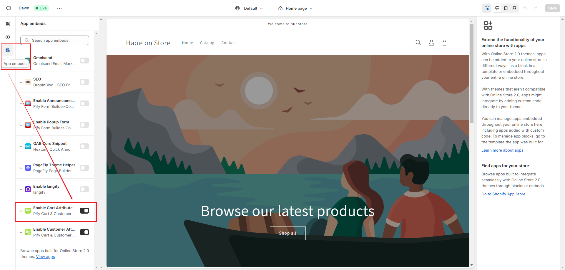 1. You need to go to your shop's customize page and click on "App embeds". Then, open "Enable Cart Attribute". Click "Save".