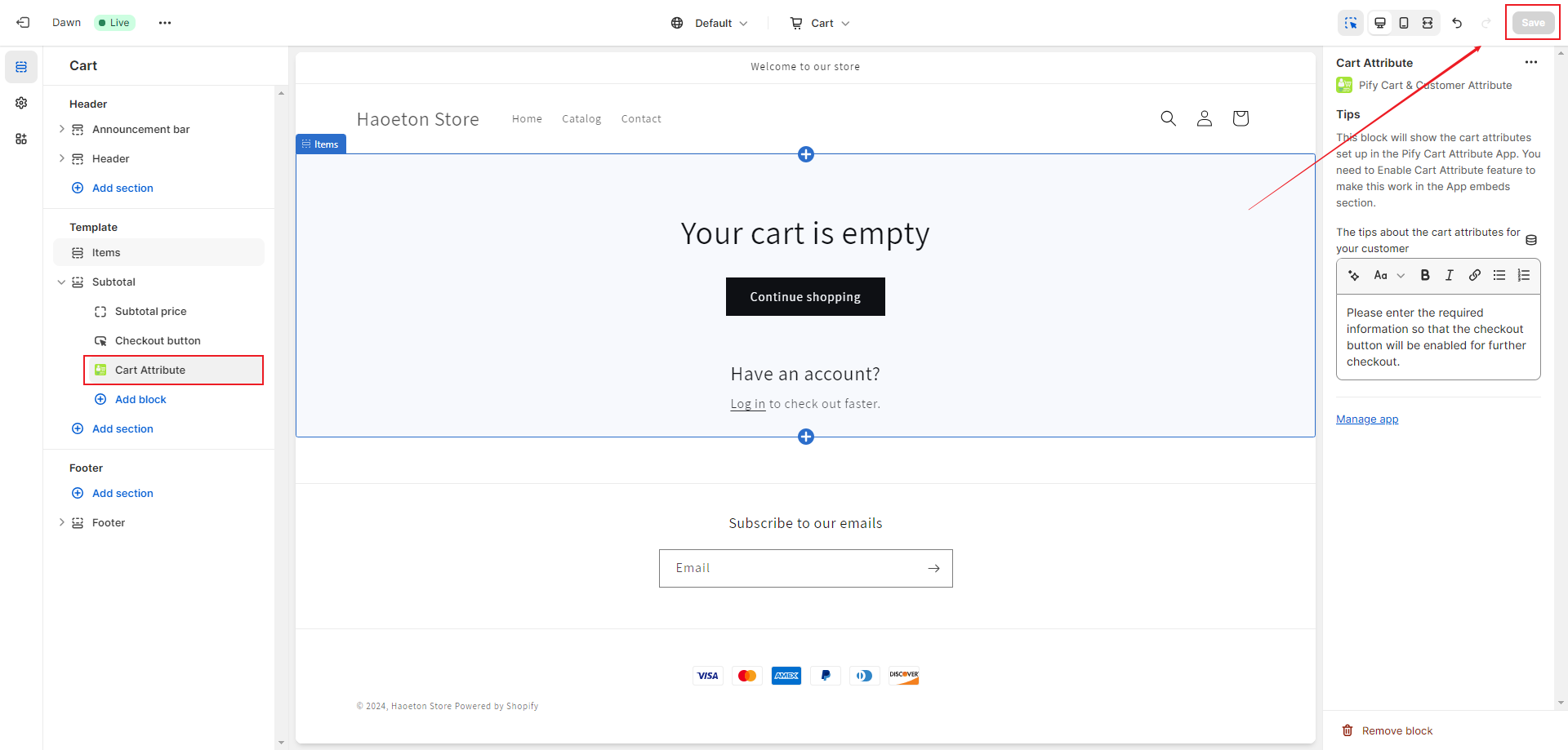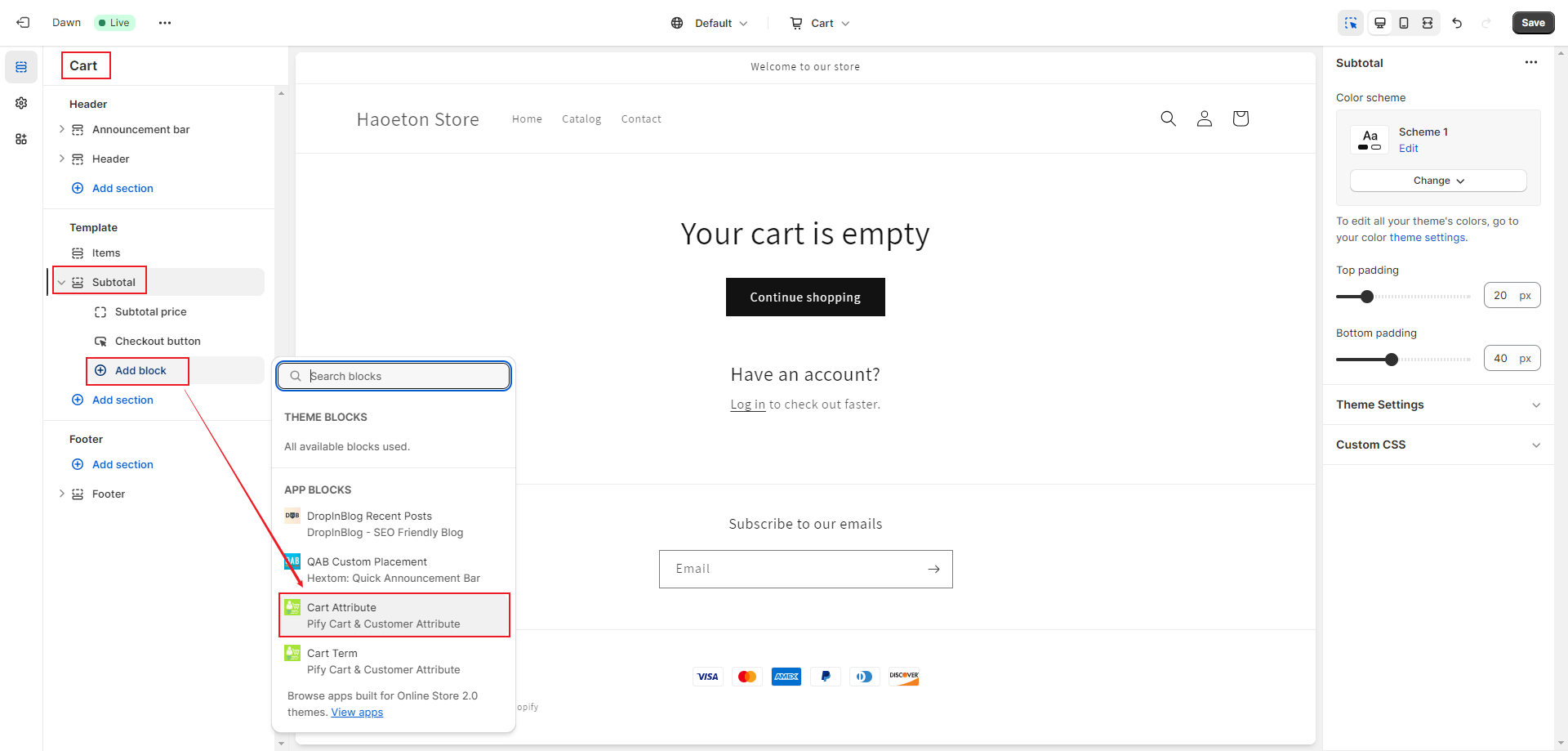 2. Switch to the Cart page, click on "Add block" under Subtotal, and add a Cart Attribute. Click "Save".