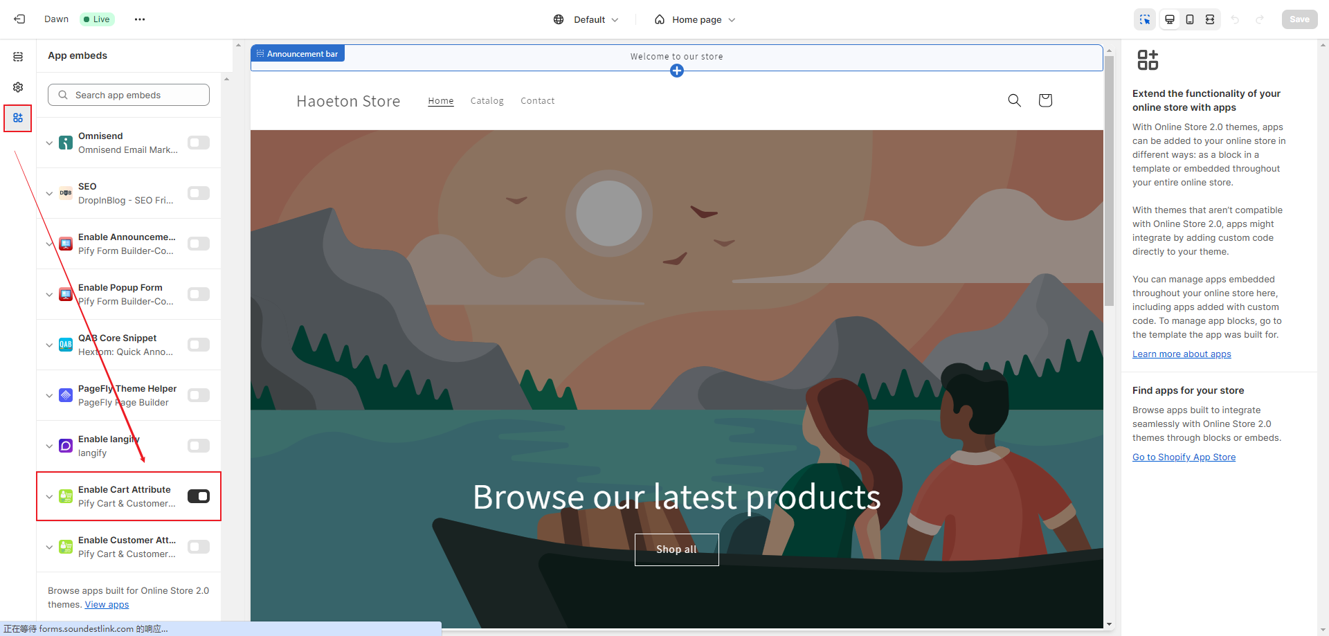 2. Click on App embeds, Enable Cart Attribute, and then Save.