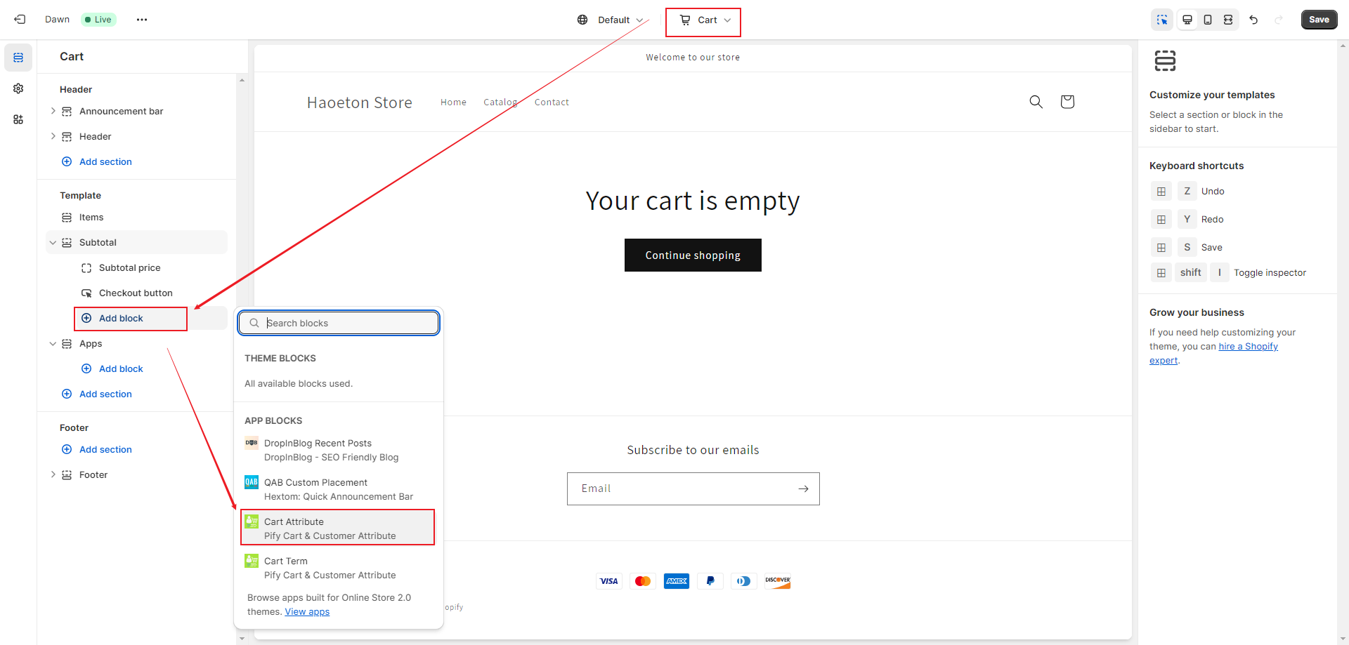 4.Click on "Add block", add "Cart Attribute", and then "Save".